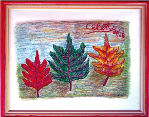 季節使大自然有了色彩變化,簡單三片葉是眾生多數總合,秋红入冬到緑意春夏,又面臨枯黃凋萎,生命的週期是循環無盡,看待此畫了解生命看透生死!