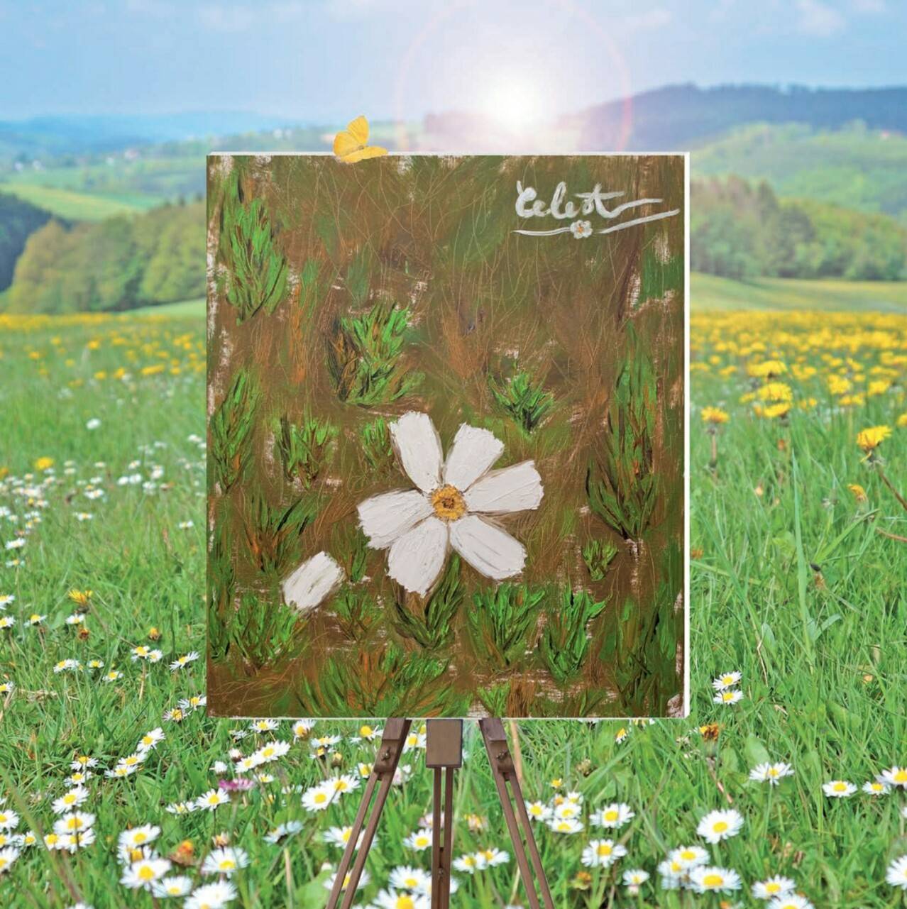 2、春天的微笑 曠野叢绿的粗細畫味,很有韻底的跳躍在背景中, 大朶展開純白花開黃蕊似臉的開心, 連旁邊小花未展也隨之響往。