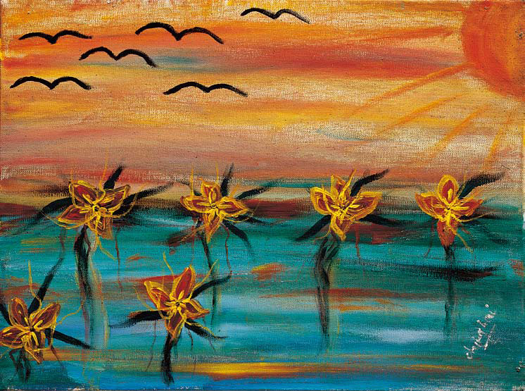 畫家以水平方向的線條來呈現平衡和動感。冷色調與暖色調對比鮮明,但又結合一體,呈現出極致的和諧。水波流動不息,更蘊含著無窮無盡的變化潛能。