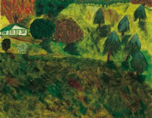 強風疾吹,豪雨襲擊,花草樹木東倒西歪,房舍也搖搖擺擺,無一安寧處。畫家動態的筆觸與刷痕,以及顛覆道統視覺概念的距離處理,突顯了掙扎與奮鬥的力道。