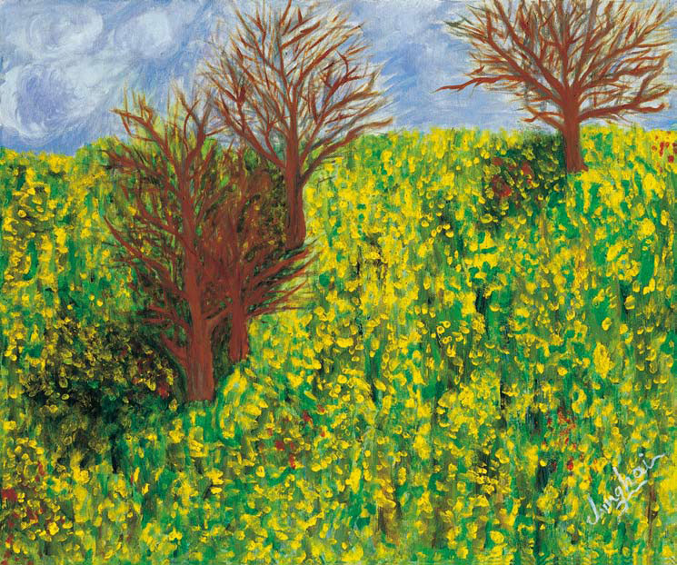 蘋果的季節已過,果葉凋落,枝幹冷清,生機似乎已失。但希望永在,樹下的芥菜園裡正開滿小黃花,讓我們擁抱這花的海洋吧!