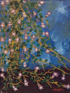 在沈悶的冬天之後,大地回春,百花怒放,一如星辰,在夜空中綻放光明,又如耶誕夜的點點燈火,閃爍著快樂。能量的流動在這幅畫中神奇地變化著,故名「法喜充滿」。