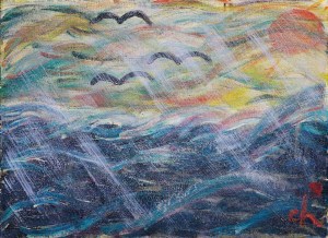整幅畫表現颱風來臨前,天地驟變的一瞬間。大海拍打出雄偉的韻律,急雨橫貫天空,海鷗在風暴中振翅疾飛,勇敢地穿越狂風巨浪。